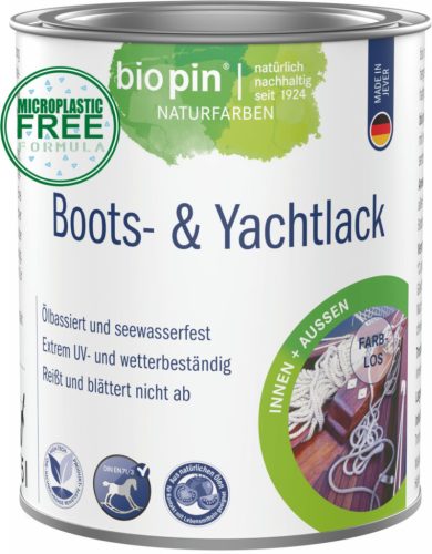 Termékleírás: A biopin Hajólakk egy hagyományos lakk. Kiváló terülé-sű, tartós, rugalmas felületet képez és megfelel a legma-gasabb követelményeknek. A szélsőséges időjárási viszonyoknak, a tengervíznek és a dörzsölésnek kitűnően ellenáll. Jó beszívódási és tapadási képességgel rendelkezik és szakszerű felhasználás esetén hosszú éveken keresztül ellenálló marad a napfény UV sugárzásával szemben.
