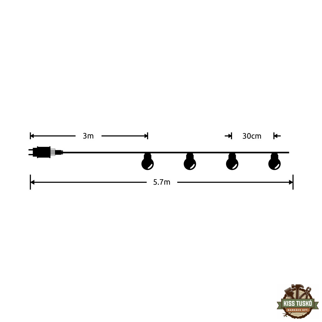 Méreteit tekintve 5,7 méter hosszú, ebből 2,7 métert tesz ki a fénnyel teli zöld kábel amikre összesen 10 darab LED chip van szerelve, 3 méter pedig a csatlakozó. Az izzó formába helyezett LED-ek 30 centiméterenként helyezkednek el. Elhelyezése roppant egyszerű. Csatlakozás szempontjából EU szabvány dugvillával csatlakoztatható a hálózatra.