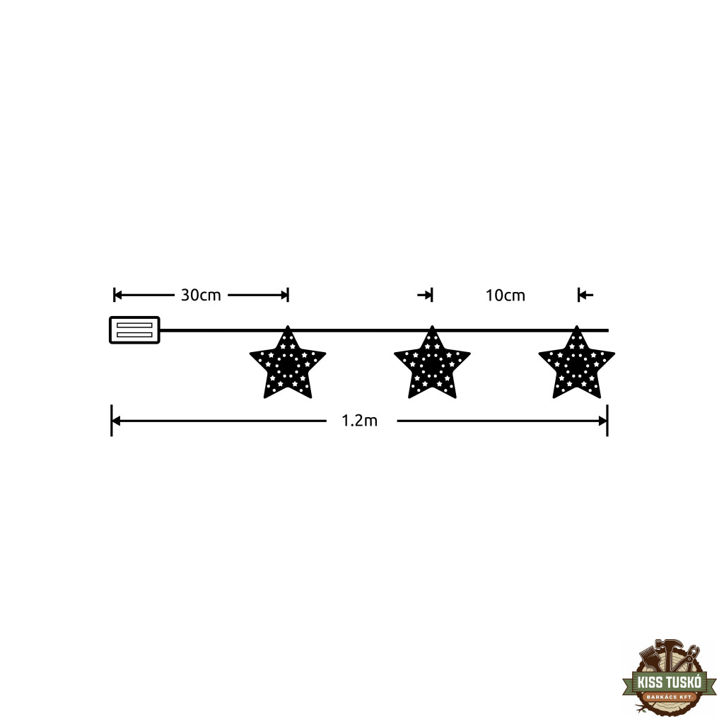 Méreteit tekintve 120 centiméter hosszú és összesen 10 LED chip van rászerelve. A csillag formájú izzók 10 centiméterenként helyezkednek el. A  füzérhez 30 centiméteres kábellel egy elemtálca csatlakozik, amelybe 2 darab ceruza (AA) méretű elemet helyezve tudjuk használni a fénysort. Amennyiben ilyen méretű elemből jó minőségű, tartós változatot helyezünk a készülékbe, az akár 3 napot is bír folyamatos használat mellett.