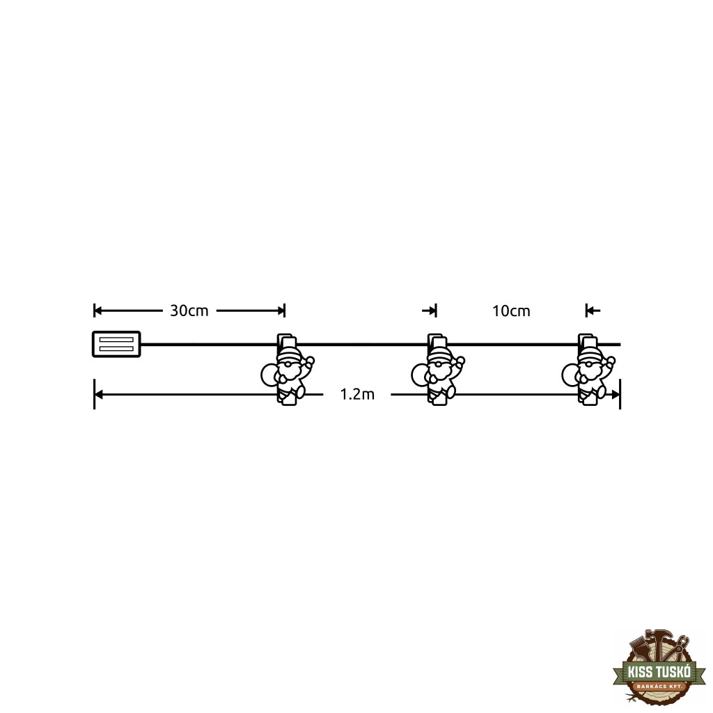 Méreteit tekintve 120 centiméter hosszú és összesen 10 LED chip van rászerelve. A Mikulás formájú izzók 10 centiméterenként helyezkednek el. A rögzített csipeszeknek köszönhetően a dekoráció elhelyezése egyszerűbbé és elegánsabbá válik. A  füzérhez 30 centiméteres kábellel egy elemtálca csatlakozik, amelybe 2 darab ceruza (AA) méretű elemet helyezve tudjuk használni a fénysort. Amennyiben ilyen méretű elemből jó minőségű, tartós változatot helyezünk a készülékbe, az akár 3 napot is bír folyamatos használat mellett.