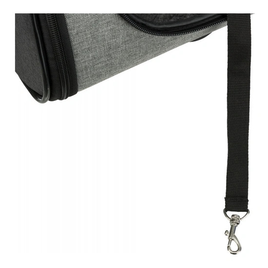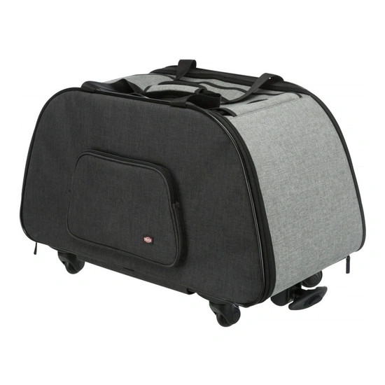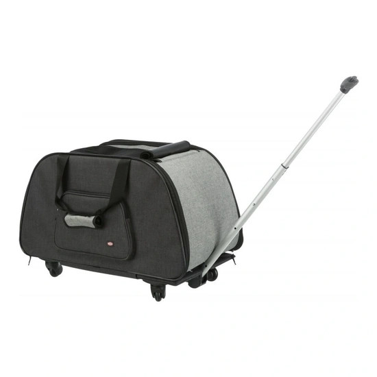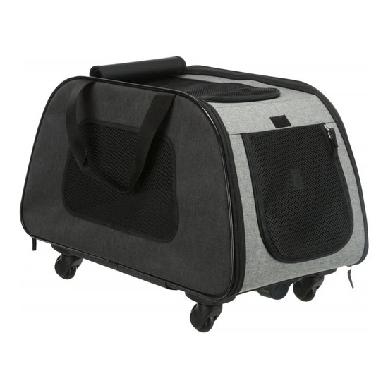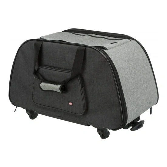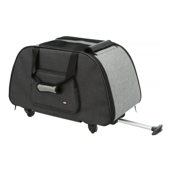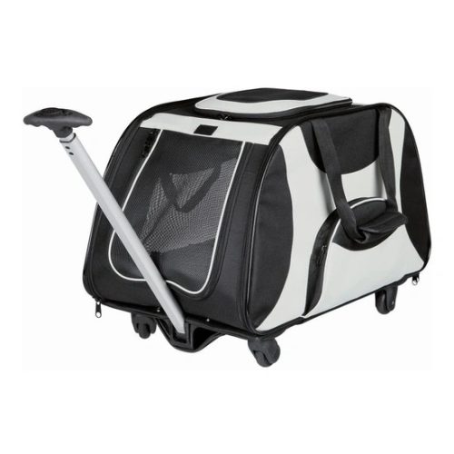 Kiváló minőségű poliészterből készült. Szintén használható szállító dobozként vagy hordozóként az eltávolítható futómű miatt. Az elején és a tetején nyitható. Teljesen behúzható teleszkópos markolat. Tároló rekesz az ivóvíz stb. tartására. A benne lévő rövid póráz megakadályozza, hogy a kisállat kiugorjon. Hálós betétekkel a levegőáramlása érdekében. Párnázott szőrme betéttel (eltávolítható). Szín: fekete / szürke.
